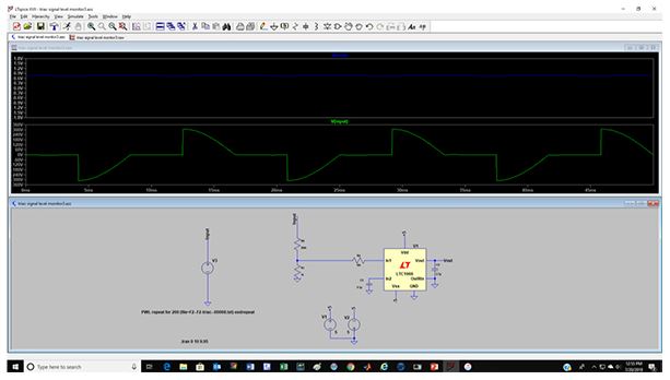 この例でも、実際の波形はPWL源を使って取り込んでいます。ピークツーピーク値が620Vのこの波形は、200:1の電圧除算器で減衰されます。LTC1966 RMS-DCコンバータのRMS出力として得られる数値は0.767Vです。これは、回路入力のRMSレベルが155Vであることを示しています。