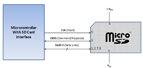 図2:SDモードを使用するmicroSDHCカードへのインターフェースでは、簡単な6シグナルのインターフェースを使用して、最速のメモリアクセスが提供されます。(画像提供:Digi-Key Electronics)