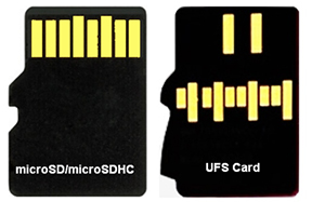 図4:左側はmicroSDHCカード、右側は新しいUFSカードです。UFSは、差動双方向データ転送によってmicroSDHCの2倍の速度をサポートします。(画像提供:Digi-Key Electronics)