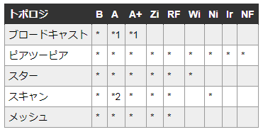 図2のa、b、c、d、eはネットワークトポロジを示し、表1ではこれまでに説明した各ワイヤレステクノロジがサポートするトポロジを示します。