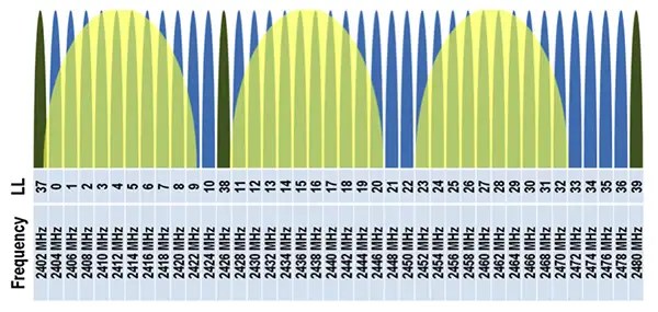 図5:Bluetooth Low Eenergyのアドバタイジングチャンネルは、Wi-Fiのデフォルトチャンネルから離して配置されています。Wi-Fi干渉の可能性がないチャンネルがさらに7つあることに注意してください。(画像提供:Nordic Semiconductor)