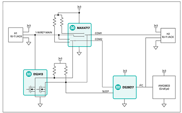 DS2413がそのエニュメレーションコードを受信すると、DS27E17との通信のためにMAX4717デュアルSPDTスイッチがCOM2に接続します。ボードがアドレス指定されていない時、MAX4717はCOM1に接続され、ホストプロセッサはダウンストリームで接続されている可能性のある他のMAXREFDES131#ボードと通信できます。DS28E17からCOM2を取り外すと、スリープモードに移行し、AMG8833の電源が切断されます。スリープモード時のMAXREFDES131#の消費電力は、スリープモードでない時の約8mAと比較して、約0.5mAです。