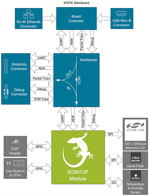 Silicon Labsは、 SLWSTK6101C開発キットにより、そのレベルのハードウェア実装も排除します。さまざまなBluetoothデバイスのプラグインボードと連携するように設計されているSLWSTK6101Cは、MacronixのMX25R8035F 8Mビットフラッシュ、Sharp MicroelectronicsのLS013B7DH03 128 x 128 LCD、およびSilicon Labsの Si7021温度および湿気センサを含む代表的なIoT設計を提供します。この場合、開発者は、BGM13Pモジュールが組み込まれているSLWRB4306A無線ボードをSLWSTK6101C ボードに挿します。