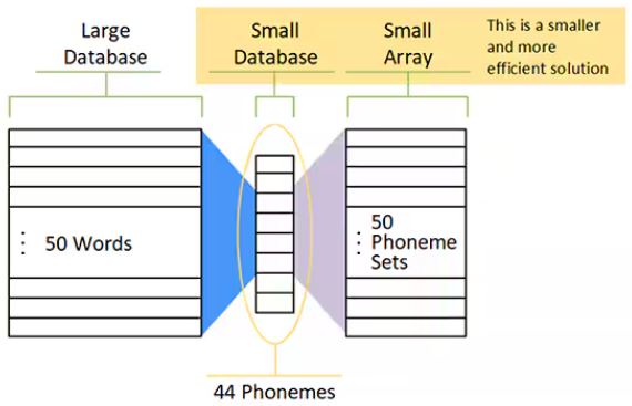 英語の音素数は44、イタリア語の音素数は32、伝統的なハワイ語の音素数は14です。VUIが200の単語からなる英語のコマンドセットを使用する場合、各単語は44のセットから関連する音素に分解することができます。