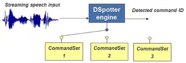 DSpotterライブラリは、入力された音声を処理し、データベース内のコマンドに一致する音素を検索します。マッチすると、インデックスとグループ番号が返されます。このような準備により、メインアプリケーションコードは、コマンドワードとフレーズを処理するための階層的なスイッチステートメントを生成することができます。
