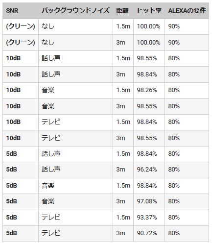 表1:さまざまなバックグラウンドノイズを含むCyberon-powered VUIのコマンド成功テスト結果。すべてのケースで、VUIはAmazon Alexaベンチマークを上回りました。(画像提供:Renesas)