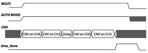 センサアプリケーションでは、プロセッサの使用前にセンサを一定期間サンプリングする必要がありますが、Flexiモードではペリフェラルの動作を継続できるので、これらのアプリケーションでの一般的な問題に対して、電力効率に優れたソリューションが提供されます。このケースでは、内蔵ADCのオートサイクルモードを使用して、選択したチャンネルで変換を実行し、DMAコントローラが自動的にSRAMにサンプルを転送するように設定します。プログラマが指定した回数の変換とDMA転送が終わると、DMAコントローラは割り込みを発行し、サンプリングされたデータを処理するためにコアをウエイクアップします(図1)。