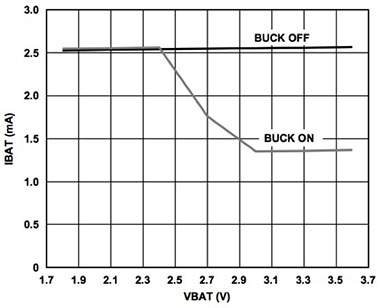 コンデンサベースの高効率チャージポンプトポロジに基づいて、このコンバータはLDOに供給される電圧レベルを下げます。その結果、MCUは、VBATの高い電圧レベルで、消費電力を大幅に削減します(図4)。電圧レベルが約2.3Vより低い場合、降圧コンバータはバイパスモードに移行し、VBATに追随します。