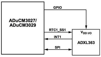 SensorStrobeは特別なRTC1アラームで、MCUのRTC1_SS1ピンで出力パルスを生成します。ADuCM3029のSensorStrobe出力を、Analog DevicesのADXL363などの外部のマルチセンサデバイスに接続すると、わずか数個の部品で非常に消費電力の低いサンプリングソリューションを構築できます(図5)。