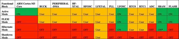 表1:Analog DevicesのADuCM3029 MCUのパワーモードでは、特定のオンチップブロックへの電力供給が自動的に有効(緑)または無効(赤)になりますが、一部のペリフェラル(オレンジ)への電力供給は開発者が制御できます。また、ハイバネートモード中も保持されるSRAMのサイズを設定できます。(表提供:Analog Devices)