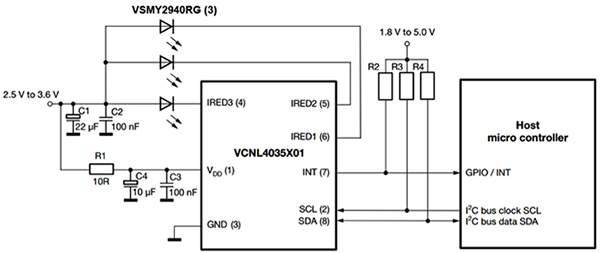 図4:VCNL4035は最大で3個までの外部赤外線エミッタを駆動でき、周囲光センサを内蔵しています(画像提供:Vishay Semiconductor)