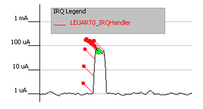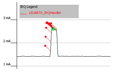 アクティブなプロセッサコアでコードを実行すると、一定して数ミリアアンペアの電流を消費します。グラフをクリックすると、ドレインの原因になっている関数をハイライトできます。エネルギーを節約するためには、MCUで、使用可能なデータをチェックするためのポーリングを回避する必要があります。そのため、データをフェッチしていないときはプロセッサをスリープ状態にし、バッファデータが使用可能になったら、割り込みを使用してプロセッサを起動します。スリープ中は消費電流が大幅に低下し、割り込みサービスルーチン(ISR)の実行中はスパイクが発生します。エネルギープロファイラウィンドウでISRを特定すると、これを確認できます。