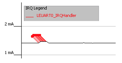 ただし、データ受信割り込みが処理されると、別のコード部分によって、プロセッサをアクティブに維持した場合よりも大きい電力が消費される可能性があります。該当する関数をクリックすると、送信機能が、より高い電力を消費していることが分かります。簡単な方法で送信機能をプログラミングすると、while{}ループ内で各バイトの転送が終わるまで待機するような設定になりますが、この場合、必要以上にプロセッサが実行し続けます。受信ポートの場合と同様に、それぞれのバイト送信が完了した後にプロセッサを起動する割り込みを使用して、このループを置換することができます。その場合、各フレームバイトの合間にプロセッサがスリープモードに入るので、平均消費電流が低下します。