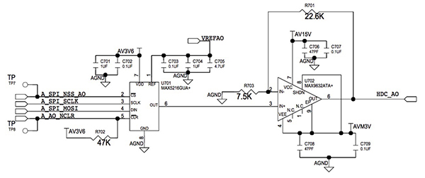 たとえば、DAC出力機能のリファレンス設計の回路図では、Maxim Integrated製のMAX9632オペアンプを使用して、MAX5216の出力をバッファしています(図2)。