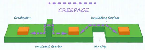 表面に沿った2つの導電性部品間の最短距離が沿面距離と定義されます(図1)。動作電圧が250~300Vの場合、IEC 60335-1ではより厳しく、強化型絶縁のために8.0mmの沿面距離を必要とし、IEC 60950-1では6.4mmの沿面を必要としています。動作電圧が200~250Vの場合、両規格とも5.0mmの沿面距離が必要です。