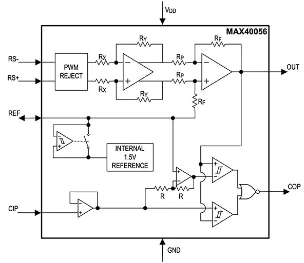 図10:MAX40056TAUA+は、内部リファレンス1.5V、強化されたPWM除去、正負両方の過電流状態を検出するための統合された内部ウィンドウコンパレータを備えています(左下、CIP入力で駆動)。(画像提供:Analog Devices)