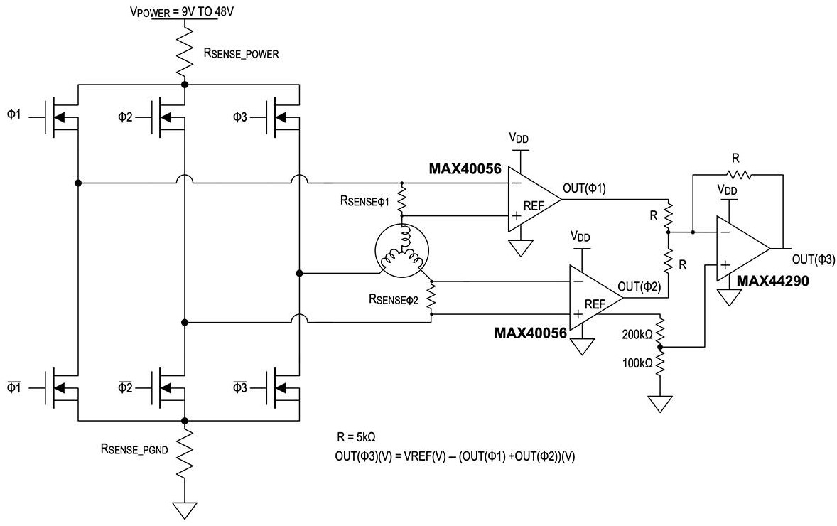 キルヒホッフの法則によると、最初の2つの巻線に流れる電流の和は、3つ目の巻線に流れる電流と等しくなります。この回路では、2つのMAX40056TAUA+双方向CSAを使用して2相電流を測定し、MAX44290ANT+T汎用オペアンプで合計します。3つのアンプの基準電圧はすべて同じなので、レシオメトリックな測定結果が生じます。