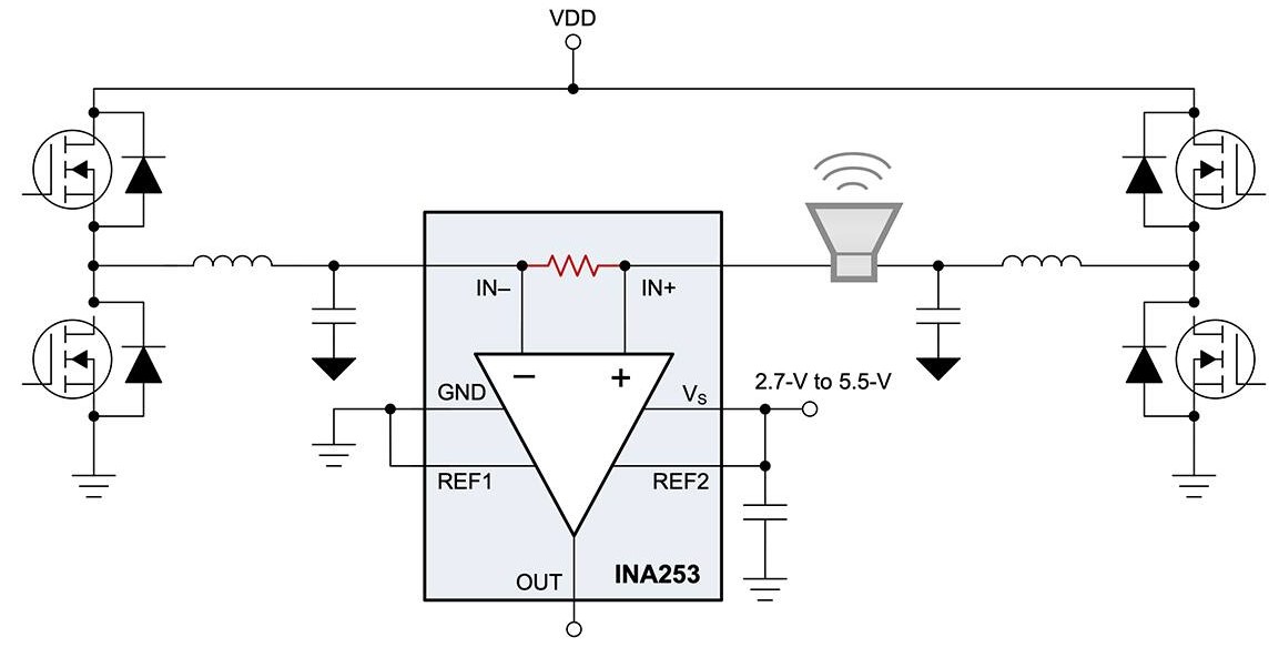 図3:D級オーディオ設計では、双方向CSA(INA253)を使用して、スピーカの機能強化や診断の実装が行えます。(画像提供:Texas Instruments)