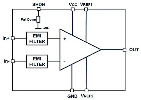 LT1999IMS8-20#TRPBFは、VSHDN(ピン8)がグランドから0.5V以内になると、約3µAを消費する低電力シャットダウン状態になります。入力ピン(+INおよび-IN)には、0~80Vの範囲内でバイアスをかけた場合(差動電圧をかけない場合)、約1nAの電流が流れます。また、1次の差動ローパスフィルタを内蔵し、デバイスの帯域幅を超える高周波信号を除去することで、EMI感受性を低減しています。