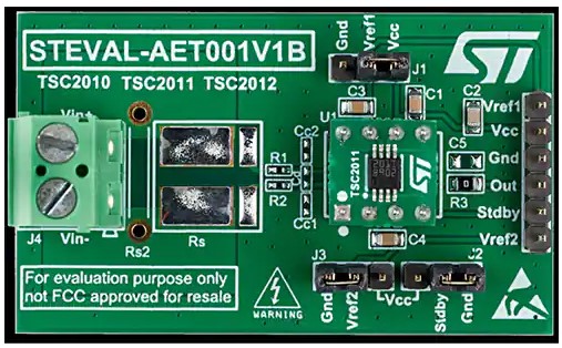 設計者は、STEVAL-AETKT1V2評価ボードを使用して、TSC2011ISTの使用をすぐに開始することができます(図6)。この製品は、-20~+70Vの幅広いコモンモード電圧で電流を検知することができます。TSC2011ISTの特長は次のとおりです。