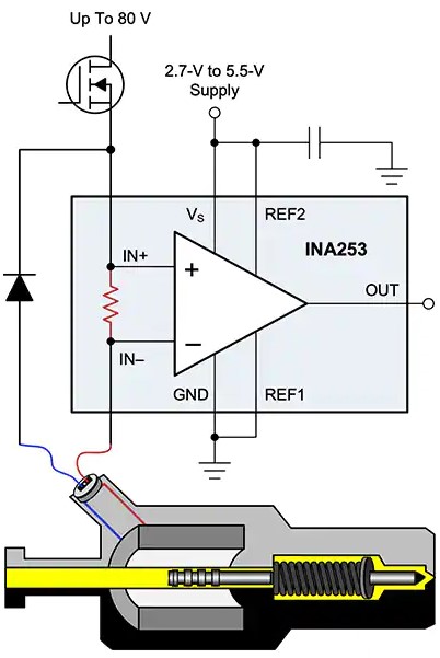 Texas InstrumentsのINA253A1IPWは、2mΩ、0.1%の低インダクタンス電流シャントを内蔵し、最大80Vのコモンモード電圧に対応しています(図7)。INA253A1IPWは、大きなdv/dt信号を抑制するために強化されたPWM除去回路を設計者に提供し、モータドライブやソレノイドバルブ制御などのアプリケーションでリアルタイムの連続電流測定を可能にします。内部アンプは精密なゼロドリフトトポロジを特長としており、コモンモード除去比(CMRR)は、DC CMRRで120dB以上、AC CMRRで90dB(50kHz)です。