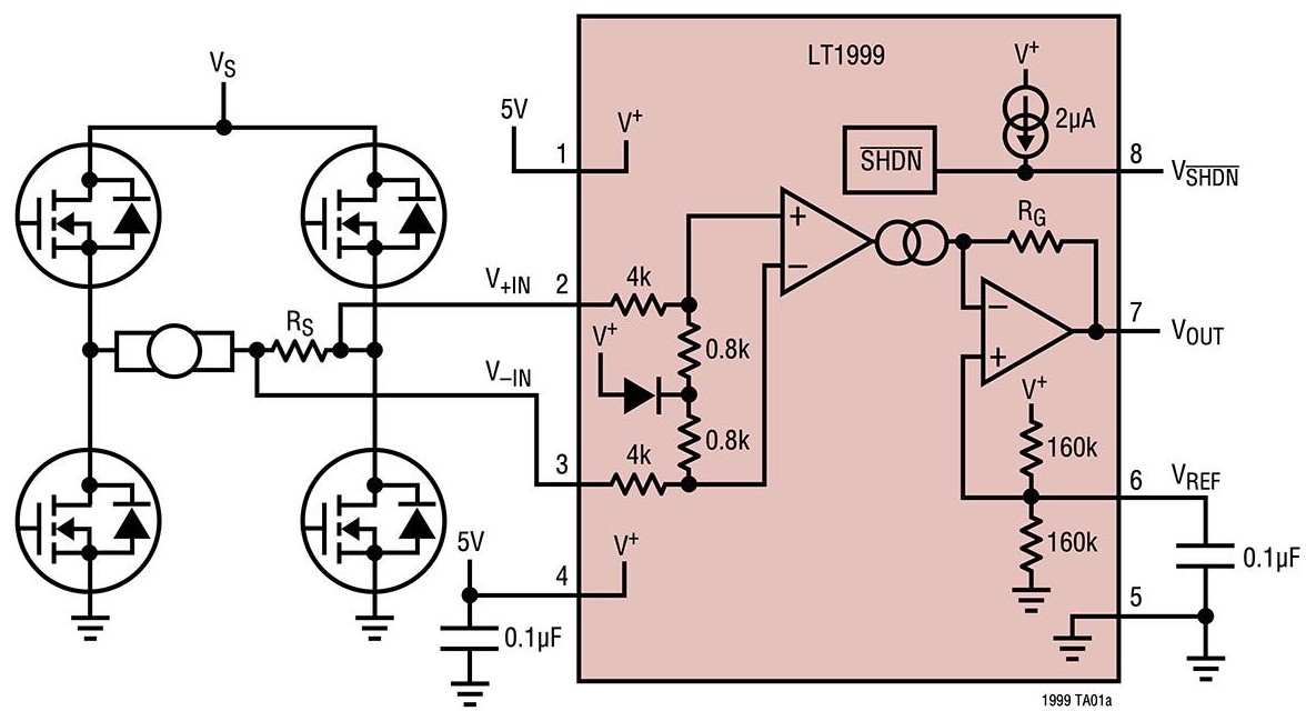 フルブリッジのモータ制御、スイッチング電源、ソレノイド、バッテリパック、および車載用アプリケーションにおける電流を監視するために、設計者はAnalog DevicesのLT1999IMS8-20#TRPBFを使用することができます(図9)。