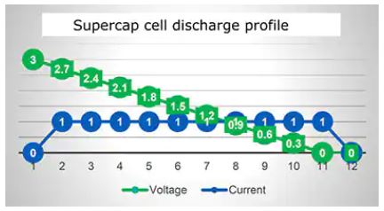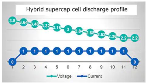 図5:ハイブリッドスーパーキャパシタの出力放電プロファイルは、電池と標準的なスーパーキャパシタの中間的なものです。(画像提供:Eatonのエレクトロニクス部門)