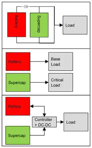 ・電池とスーパーキャパシタを独立ユニットとして使用することは、非クリティカルなベース負荷と別のクリティカルな負荷がある場合に、それぞれに独立した電力を供給できるため最適です。ただし、このアプローチでは、別々のユニット間の相乗効果のような利点は得られません。