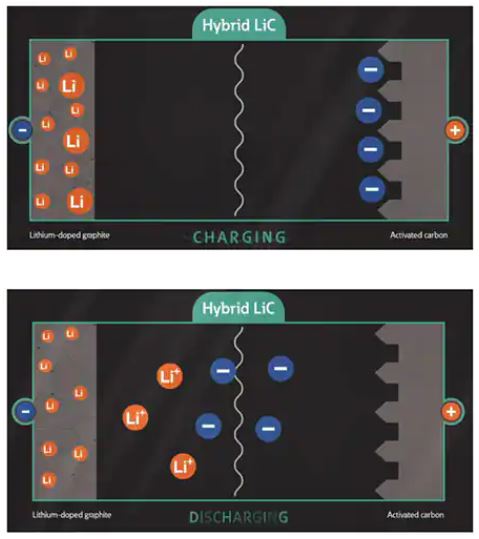 ハイブリッドスーパーキャパシタは、Liドープ黒鉛陽極と活性炭陰極からなる非対称型のデバイスです。電荷移動は主に電気化学的に行われますが、その深さはLiイオン電池に比べて格段に低いものです。
