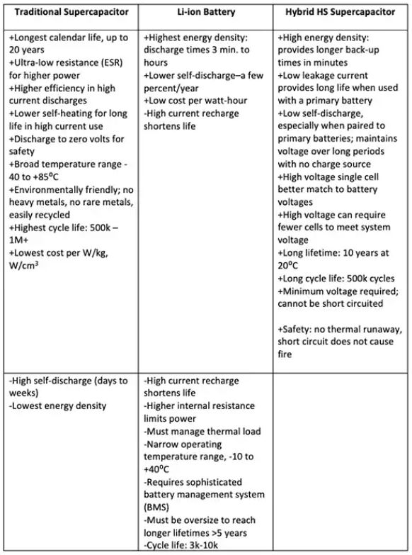 表1:電池、スーパーキャパシタ、ハイブリッドスーパーキャパシタの代表的な特性の比較は、ハイブリッドが両方の長所を兼ね備えていることを示しています。(表提供:Eatonのエレクトロニクス部門のデータをもとに著者が作成)