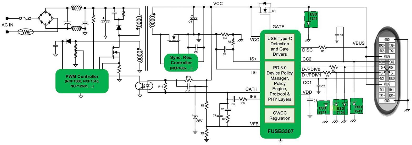 FUSB3307は、AC/DCとDC/DC充電器の両方をサポートするように設計されており、PD電源に適した包括的な応答を提供することができます。その結果、設計者はFUSB3307と比較的少数の追加デバイスとコンポーネントで、USB-C PD 3.0互換の電源を実装することができます。