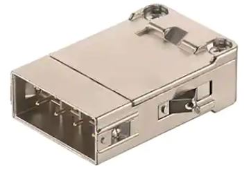 Han-Modularシリーズには数多くのコネクタやコンタクトがありますが、その中からいくつかを簡単にご紹介します。まず、コネクタモジュールを保持するフレームがあります。一例は、6つのモジュール用の09140240313ヘビーデューティヒンジ付きフレームです(図6)。個々の接続モジュールは、このフレームに挿入され、固定され、ロックされます。