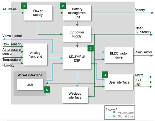 図3:この人工呼吸器のブロック図では、PPTCデバイスを電池管理システムやUSBポートセクション(領域2と領域5)に使用できます。(画像提供:Littelfuse, Inc.)